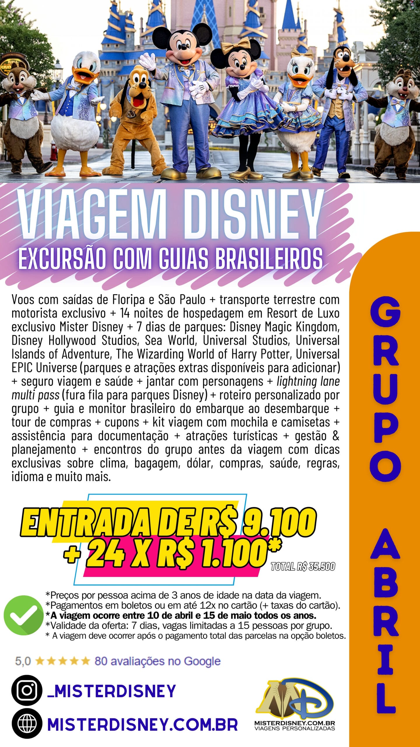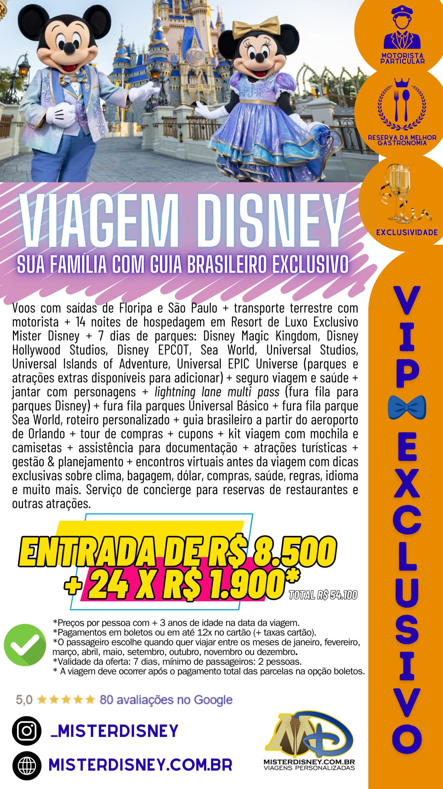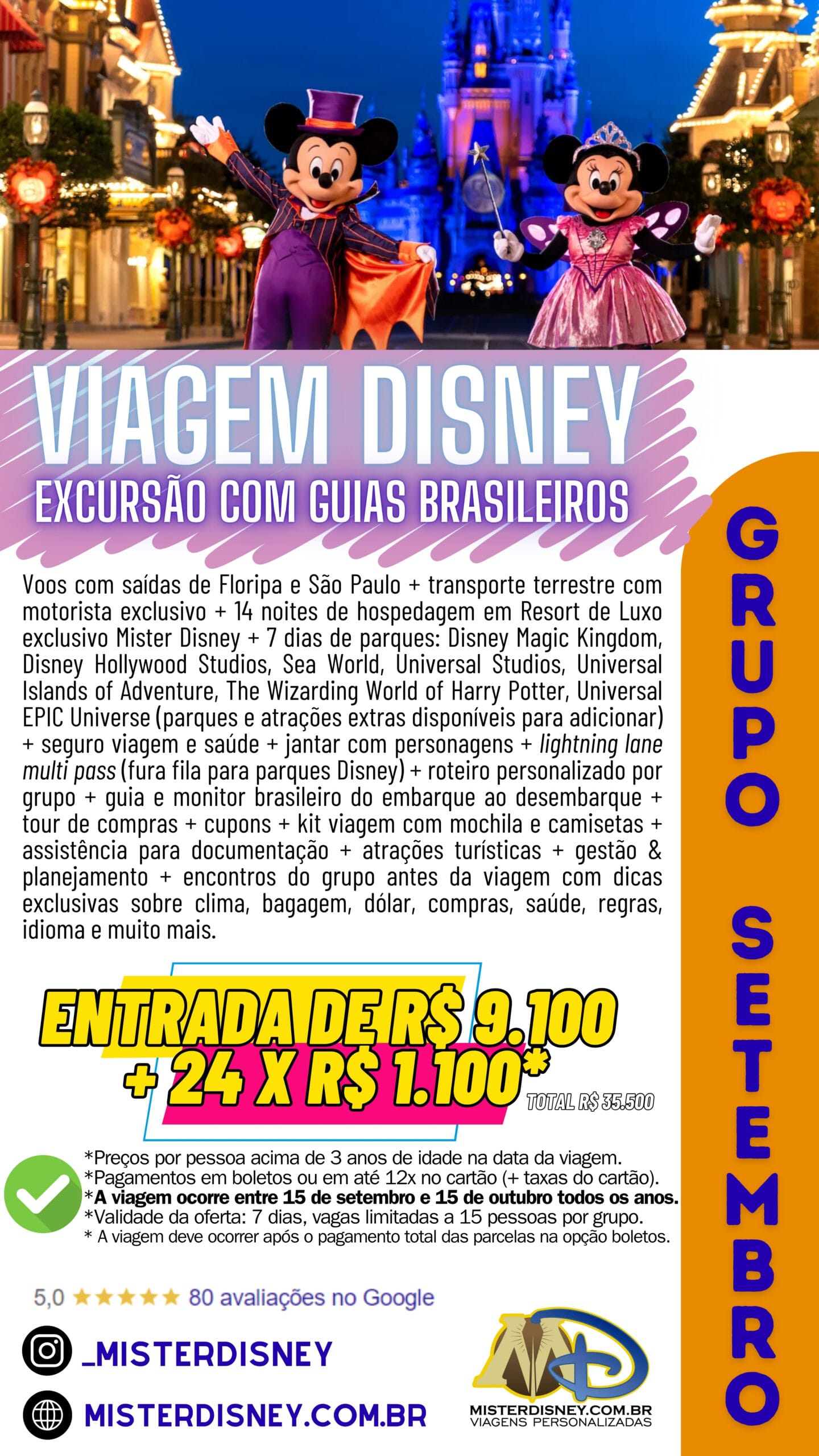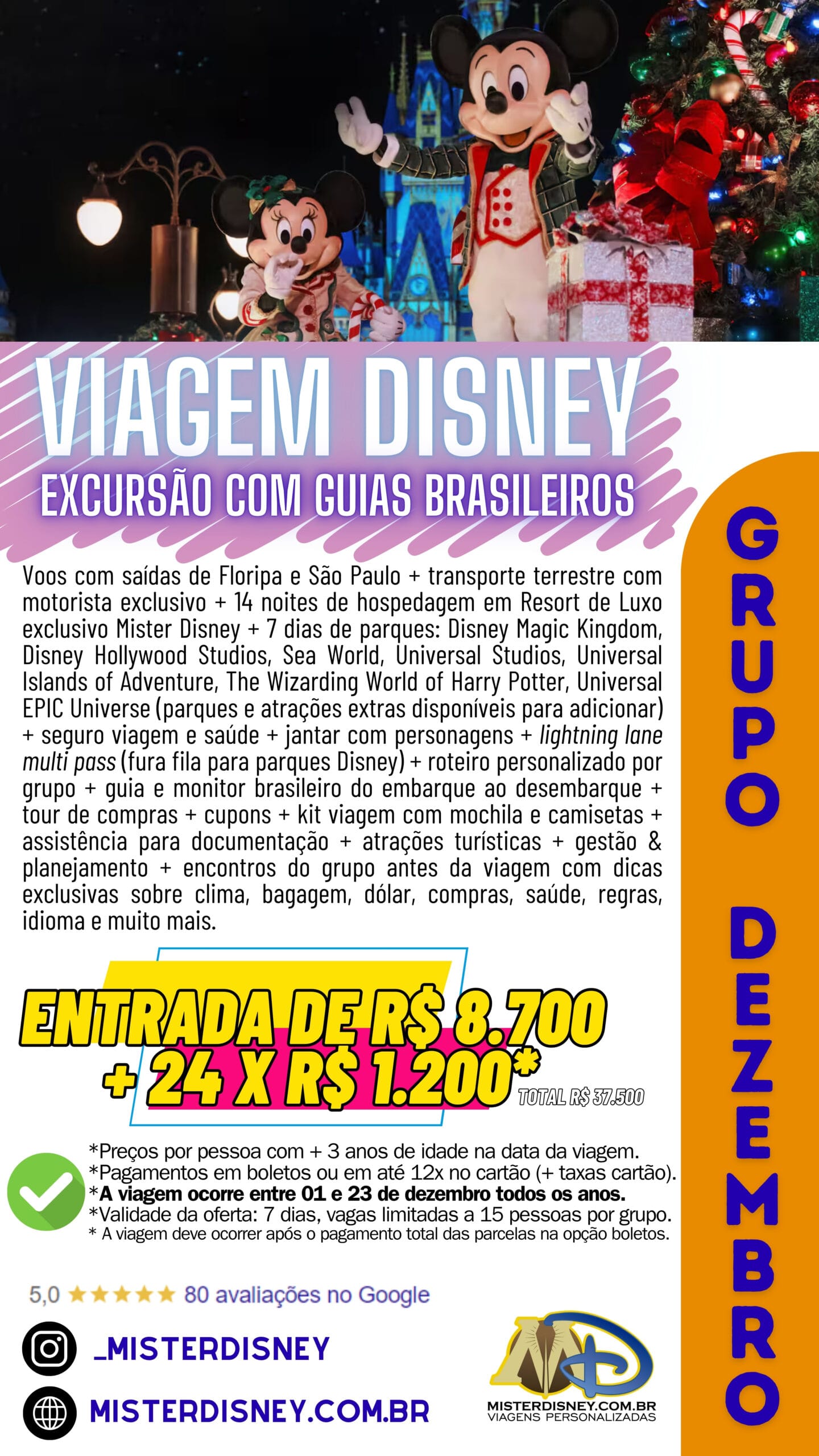 EXCELENTE Com base em 49 avaliações Publicado em Paula Farias16/06/2024Trustindex verifica se a fonte original da avaliação é Google. Maravilhoso!Publicado em Beatryz Oliveira Prestes16/06/2024Trustindex verifica se a fonte original da avaliação é Google. Estou super impolgada e motivada coma viagem pela bela organização da empresaPublicado em João Vitor Pereira Martins15/06/2024Trustindex verifica se a fonte original da avaliação é Google. Empresa extremamente proativa, cativante, organizada e comprometida do princípio ao fim! Altamente qualificados.Publicado em Fernando Pereira Martins15/06/2024Trustindex verifica se a fonte original da avaliação é Google. Empresa séria, vale muito o assessoramentoPublicado em Marcela Prestes Tieppo15/06/2024Trustindex verifica se a fonte original da avaliação é Google. Desde o início do planejamento sobre a viagem foram super prestativos, receptivos, muito educados e gentis. Em preparação de tirar visto, passaporte, encontros e etc, sempre tem uma super organização. Estou amando!!Publicado em Daiana Mendes13/06/2024Trustindex verifica se a fonte original da avaliação é Google. Desde o primeiro contato fomos muito bem recebidos, uma empresa top para a realização do nosso sonho. Muito ObrigadaPublicado em Maria Estelita Buss Medeiros24/05/2024Trustindex verifica se a fonte original da avaliação é Google. Profissionais educados, atenciosos e prestativos. Auxiliam em TODA a viagem, tiram dúvidas, marcam encontros para confraternização do grupo. Parabéns à equipe! Recomendamos!Publicado em Pamella Fonseca18/05/2024Trustindex verifica se a fonte original da avaliação é Google. Minha viagem será em setembro/2024 e a Mister Disney está me ajudando a realizar esse sonho. ❤️Publicado em karina vandresen16/05/2024Trustindex verifica se a fonte original da avaliação é Google. Minha filha vai realizar seu sonho em Janeiro e escolhemos a Mister Disney que nos acolheu super bem e nos deu todo suporte para a viagem .... Adoramos..